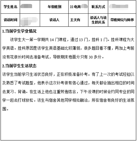 其次,带班党员王天有积极深入2022级大一新生宿舍,推动谈心谈话常态化,做好《员工谈话记录表》台账,及时掌握帮扶情况,开展帮扶新生的思想教育与交心工作,给予学习上的指导和生活上的关心,使大一新生保持健康向上的心理。