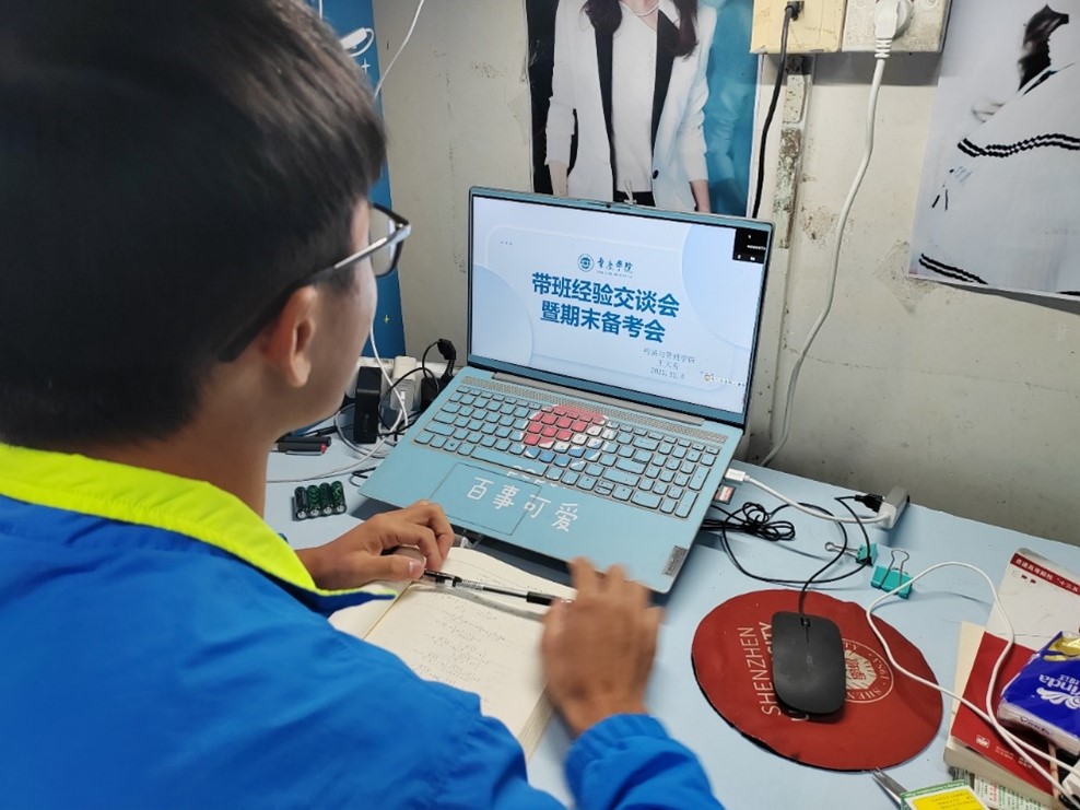 带班党员王天有在每学期期末主动开展“带班党员经验交谈暨期末备考会”,根据以往自身的复习经历,向2022级全体大一新生分享自己的复习经验和做题方法,协助大一新生制定明确的复习计划,对重点章节投入更多时间与精力,鼓励大一新生认真并独立完成科任老师布置的作业和练习,对不懂的问题,先自己思考再请教他人。通过带班党员王天有的学业帮扶和同学们的自身努力,2022-2023学年第一学期2022级电子商务专业的《经济数学I1》课程为零挂科率,同学们对王天有的帮扶表示由衷的感谢。
