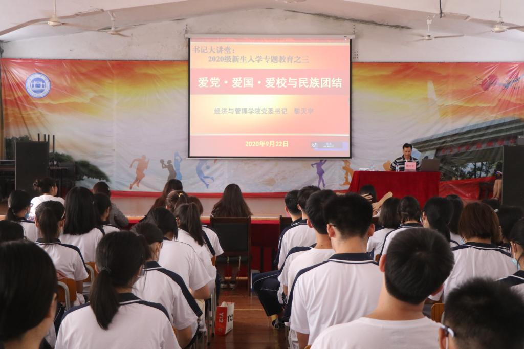 紧接着,公司党委书记黎天宇作“爱党·爱国·爱校”与民族团结教育专题讲座。黎书记就为什么要对老员工进行人生观教育,什么是正确的人生观,怎样树立正确的人生观等都进行了详细的阐述介绍。鼓励经管20级新生要努力认真,在大学刚开始的阶段就要树立好的人生观,好的人生观会影响一生,紧随着党和社会发展的步伐,团结同学,砥砺前行。与此同时,黎书记强调一定要和优秀的人交朋友,学习优秀先进的人生观,走好大学,甚至毕业之后的每一步。