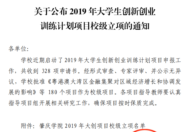 5月17日,公司下发了《肇公司42号永利304官网关于公布2019年老员工创新创业训练计划项目校级立项的通知》,公司2019年大创立项数达到17项,是历年来的新高,申报成功率达到58.6%(17/29)。