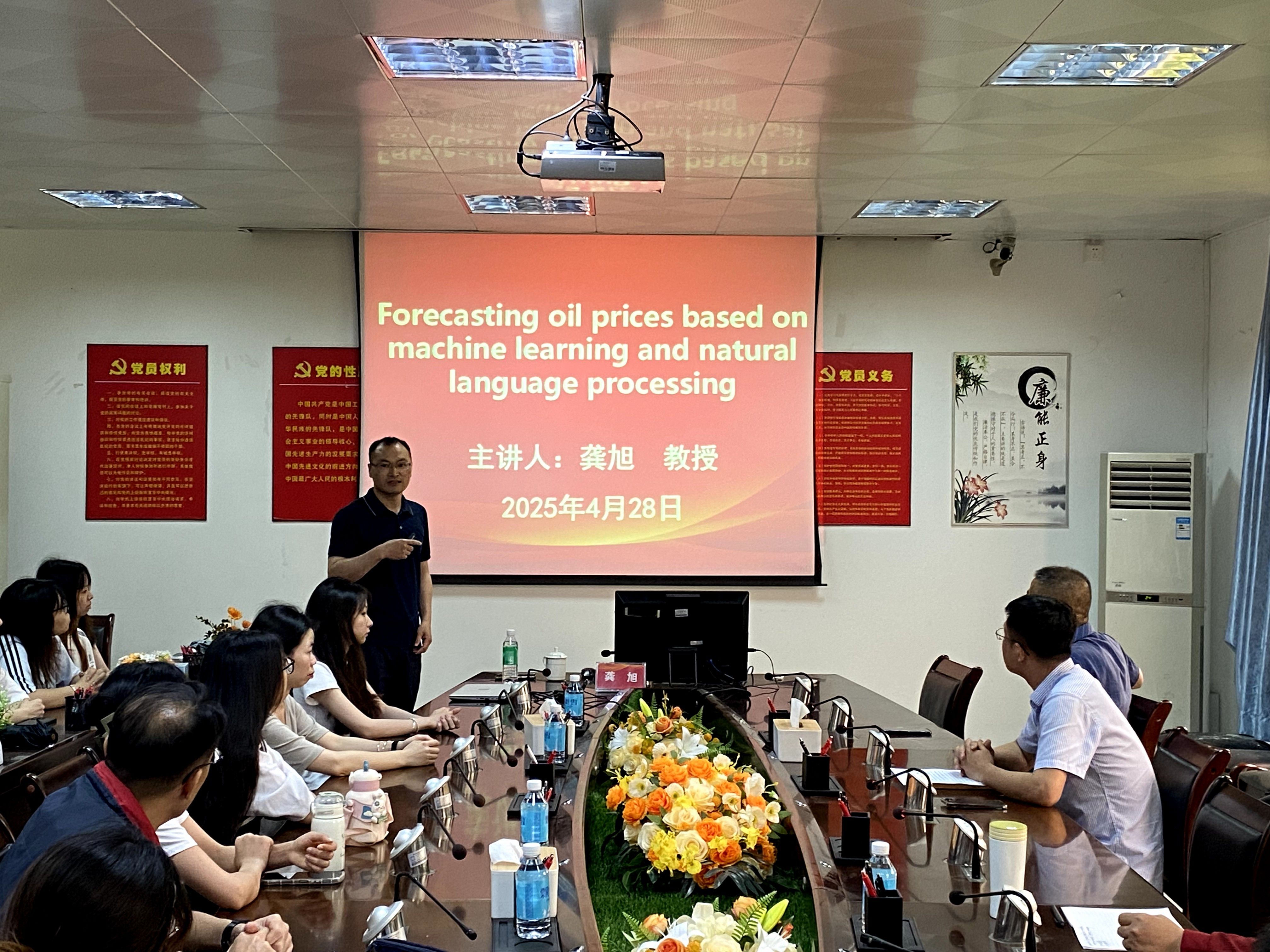 龚旭教授以“Forecasting oil prices based on machine learning and natural language processing”为主题,深入阐述了基于机器学习和自然语言处理预测油价的前沿理论与实践方法。他详细介绍了如何运用相关技术挖掘数据价值,建立精准的油价预测模型,其分享内容融合了跨学科知识,为公司教师带来了新的研究思路,拓宽了学术视野。随后,龚旭教授进行了经管类科研项目申报的经验分享。他围绕项目选题的创新性、研究方案的可行性等关键要素展开,通过自身实际案例分析,为教师们提供了切实可行的申报建议,一一解答了教师们在项目申报过程中的困惑。