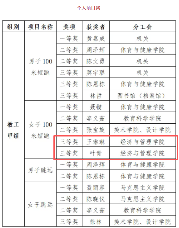 永利集团304官网荣获精神文明奖,王琳琳老师和叶青老师荣获教工甲组女子100米短跑三等奖,朱卫垣老师荣获教工丙组男子立定跳远二等奖。