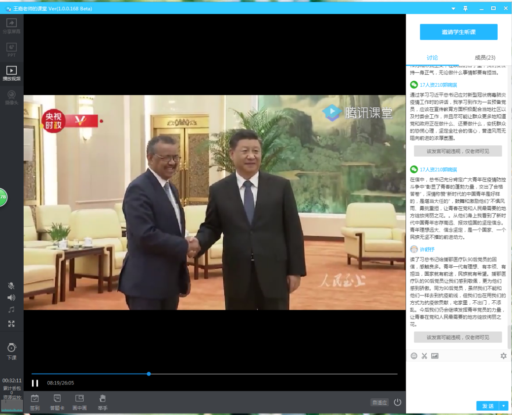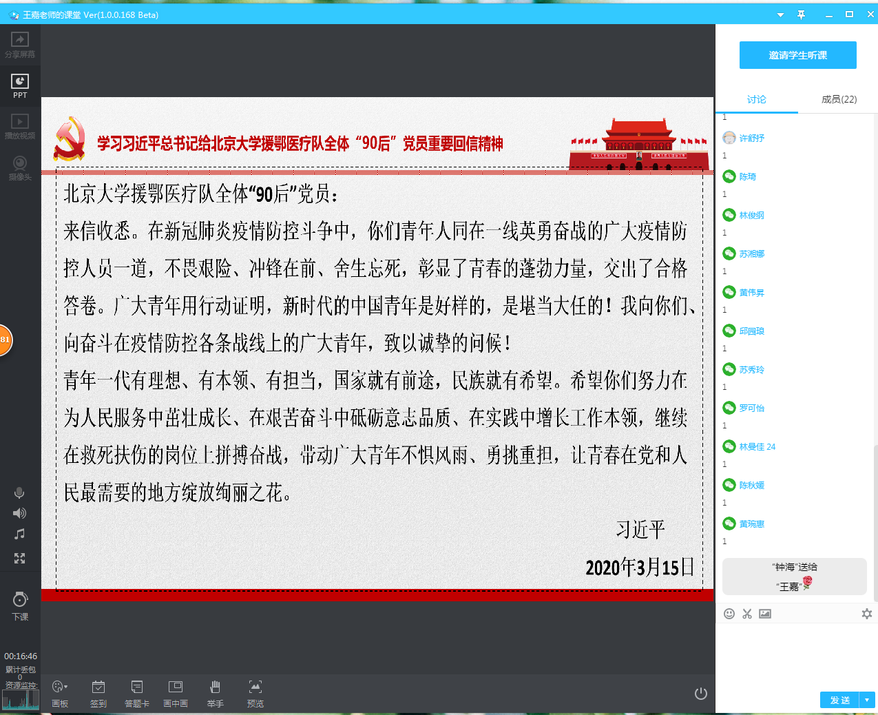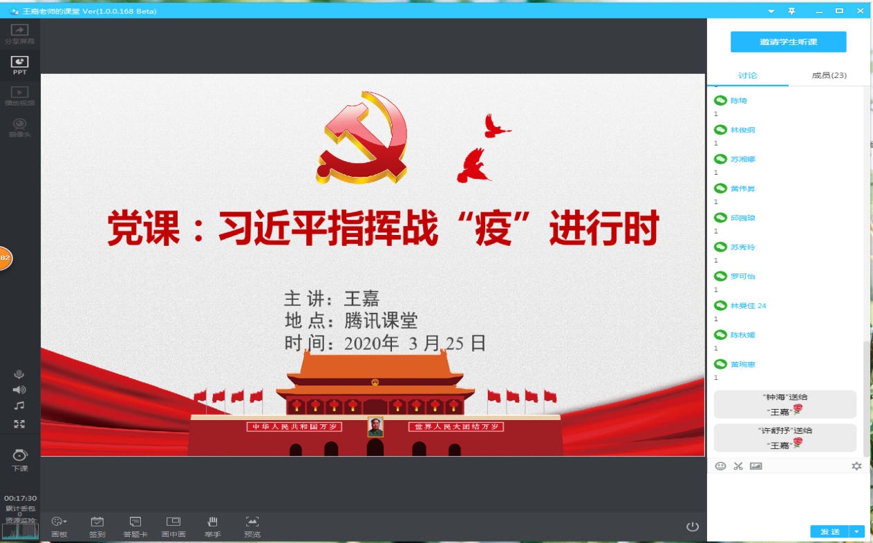 之后,王嘉老师作了题为《习近平指挥战“疫”进行时》的党课,与大家一起学习习近平总书记在中央政治局常委会会议研究应对新型冠状病毒肺炎疫情工作时的讲话精神,并观看视频《人民至上—习近平指挥战“疫”进行时》。全体党员在学习完后展开了积极的讨论,抒发自身感悟,自疫情发生以来,党中央迅速行动,始终将人民的利益放在首位。用短短10天的时间建成了雷神山医院,中国速度震撼了世界,作为一名共产党员,我们既感到光荣,又深知肩上的责任重大,唯有不断增长本领,才能让青春之花在党和人民最需要的地方绽放。