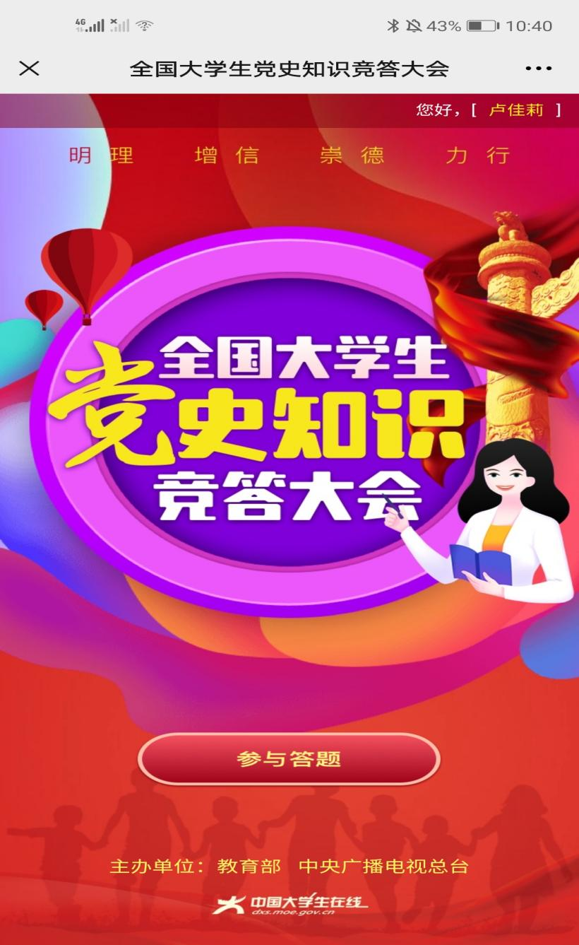 通过此次“学党史,担使命”的党史知识竞答活动,重温党的光辉历程,营造浓厚的党史学习氛围。同学们对深入学习中国共产党波澜壮阔历史充满了热情,把学党史与悟思想、办实事有机贯通,在回望党的百年历史中汲取丰厚营养和前进力量,不忘初心,砥砺前行。以优异成绩迎接党的百年华诞,努力完成新时代赋予的伟大使命!(编辑:王嘉)