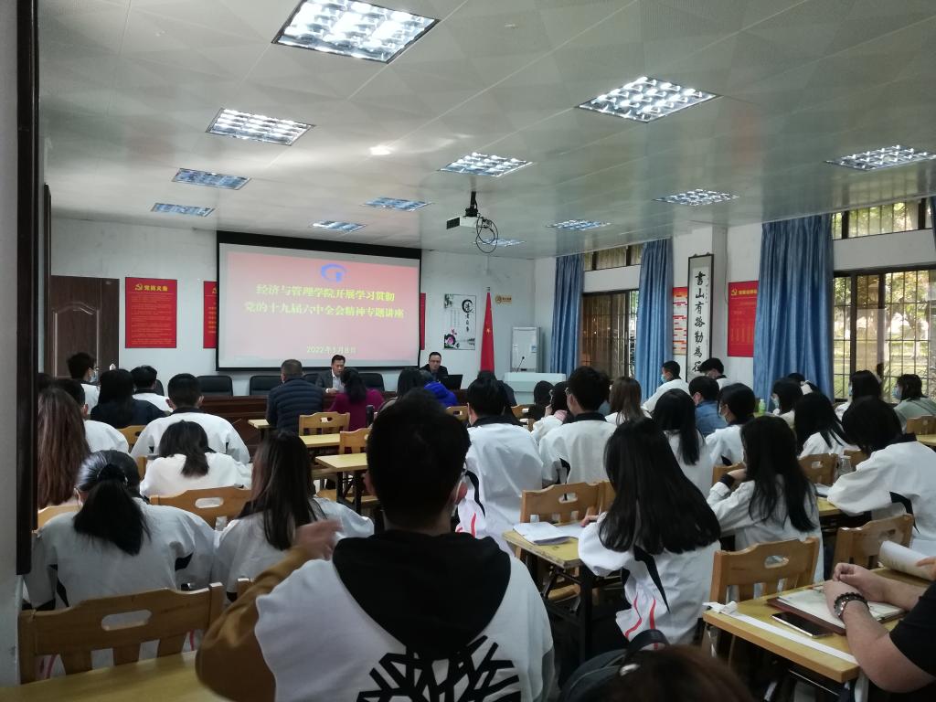 [经管公司 讯]为全面贯彻党的十九届六中全会精神,加强党史学习教育,增强青年学子的责任和使命。1月8日,公司邀请马克思主义公司谢石生博士来院作党的十九届六中全会精神专题讲座,公司党委理论学习中心组成员、中层领导干部、师生党员、发展对象、入党积极分子及入党申请人共70人到场聆听。